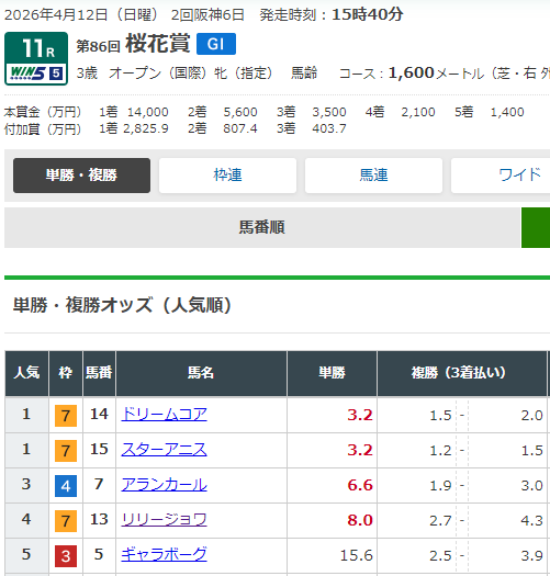 ドリームコアとスターアニスの単勝オッズが